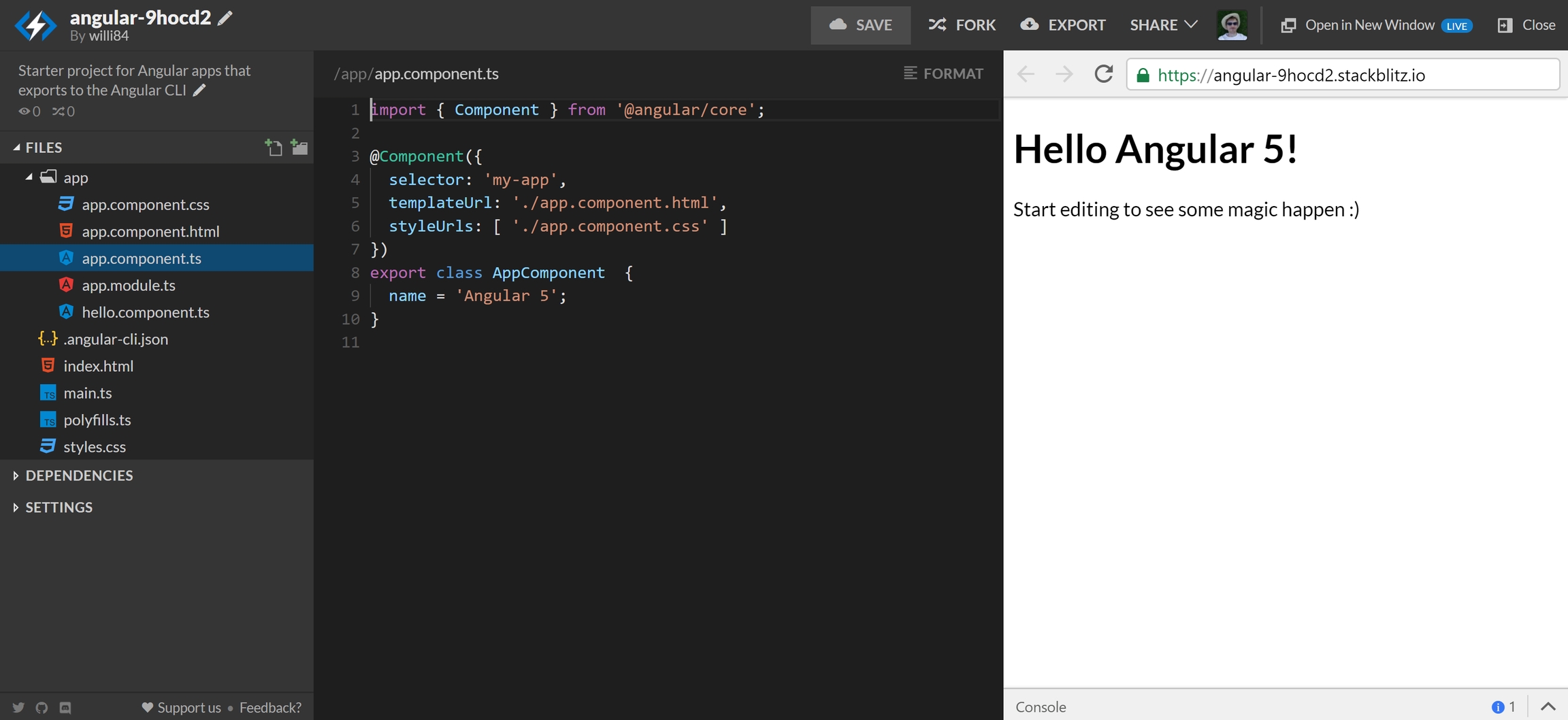 StackBlitz is an online editor which provides you all the functionality of an Online-IDE called Visual Studio Code and the Angular CLI.